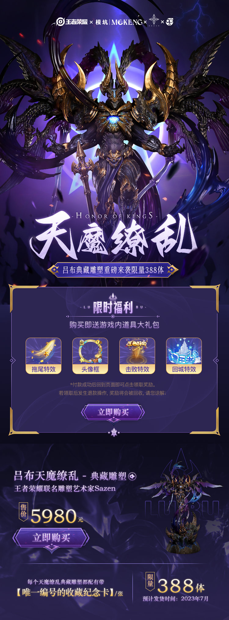 王者荣耀联合雕塑艺术家Sazen Lee,重磅推出吕布天魔缭乱典藏雕塑!以天魔缭乱的出场动画和大招状态为设计核心,精致雕刻丰富细节,打造一个霸气十足的天魔形象。