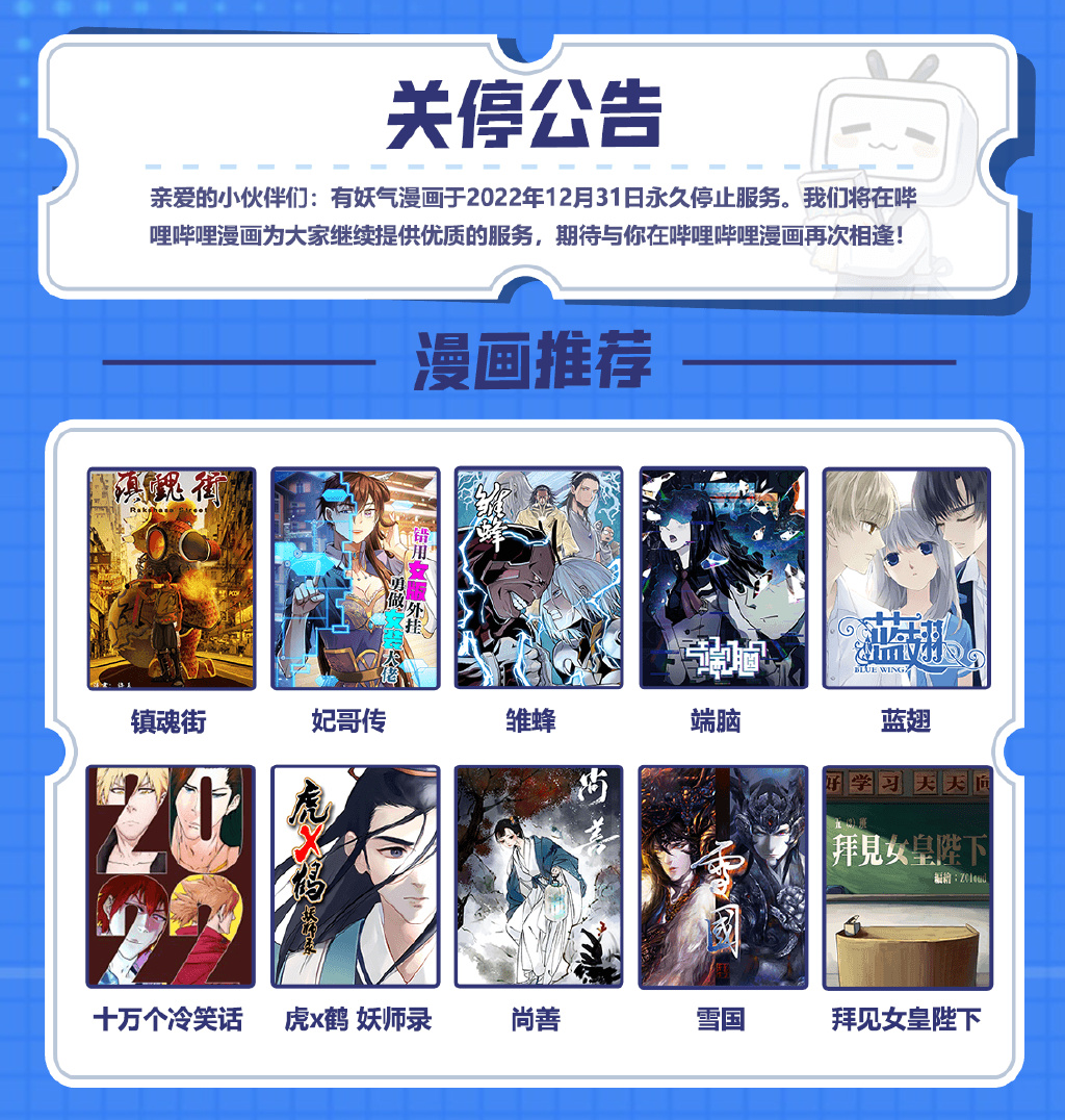 迁移公告显示,有妖气漫画即日起加入哔哩哔哩漫画大家族。用户可将自己的有妖气漫画账号和哔哩哔哩漫画账号进行绑定,一键完成资产转移。