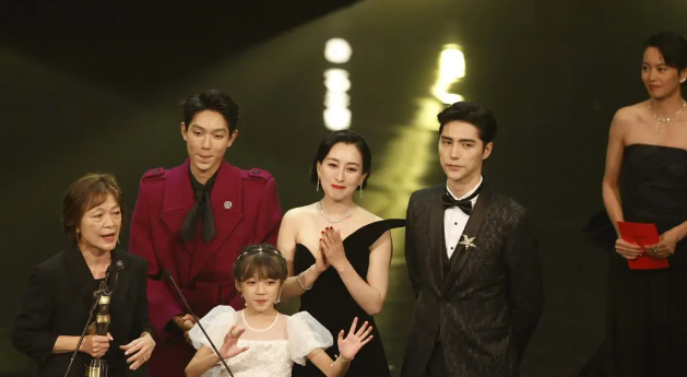 尔冬升导演的海的尽头是草原获最佳亚洲华语电影,梁咏琪颁奖,阿云嘎、马苏、罗意淳、王锵等主创人员一起上台领奖。