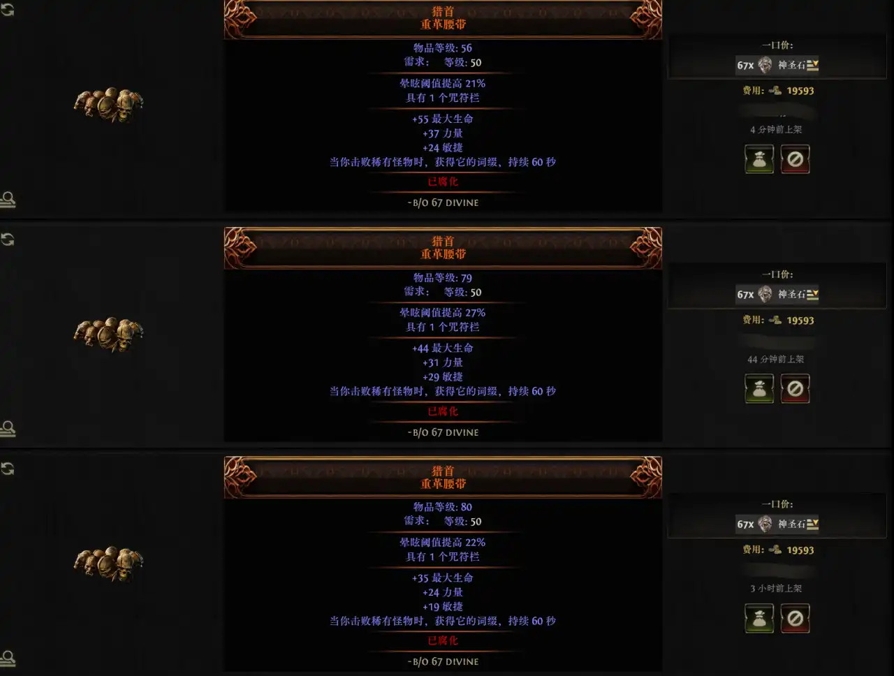 中期(剧情通关后,刷 T1-T5 地图)大家基本有了初步 BD 方向,这时候暗金要选 “能补 BD 短板” 的 —— 比如近战缺续航就选偷血装备,法系缺暴击就选加暴击的,而且这些暗金在交易行价格不贵,一般几十混沌石就能买到。
