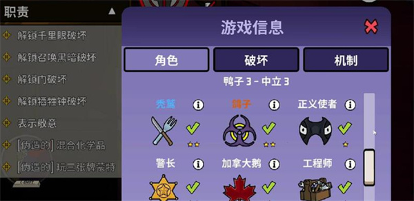 获胜条件主要有三类:一是实现人数压制,即场上存活玩家数不超过存活鸭子数(且无猎鹰角色);二是破坏取胜,在破坏任务的倒计时结束前,大鹅阵营未能完成修复;三是特定目标达成,如刀掉关键角色或开启特定破坏任务。开局首要任务是确认自身身份与队友位置,避免误伤或落单,为后续行动铺垫。