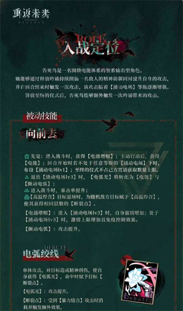 想判断要不要抽,先明确她的 “核心价值”:告死鸟是中速智性输出,主打 “持续伤害 + debuff 联动”,不算 “版本唯一神”,但绝对是 “好用的泛用 C”。她的优势很明显:大招是群体智伤,还能给敌人挂 “腐朽” debuff,后续攻击能触发额外伤害;被动在敌人有 debuff 时能提暴击率,搭配红弩箭、莉拉妮这类 “挂 debuff 辅助”,输出会更稳定。但短板也得注意:爆发伤害不如限定的维尔汀,打 “速通局” 有点吃力,更适合需要持续输出的副本(比如深层探索、主线后期 BOSS)。简单说,她是 “稳扎稳打型 C”,不是 “一波秒型 C”。