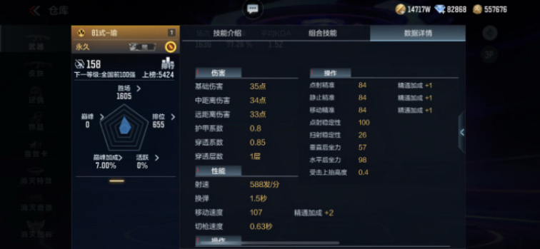 81式-瑜凭借其卓越的性能表现,在任何距离都能展现出显著优势。它不仅有着极其优秀的弹道,在穿透性能、精准性、移速与射速方面均有所提升,其穿透层数为1层,穿透系数为0.85,精度为0.85,移速为107,射速达到588发/分。穿透方面在天赋的加成下可达到满穿效果。