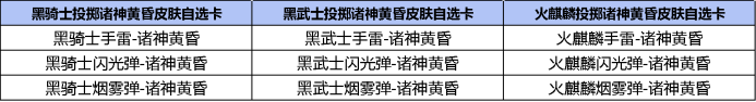 贴心的是,皮肤以自选卡的形式返场,分为主武器、副武器、近战武器、黑骑士投掷、黑武士投掷、火麒麟投掷诸神黄昏自选卡,自选卡中包括历代诸神黄昏皮肤。