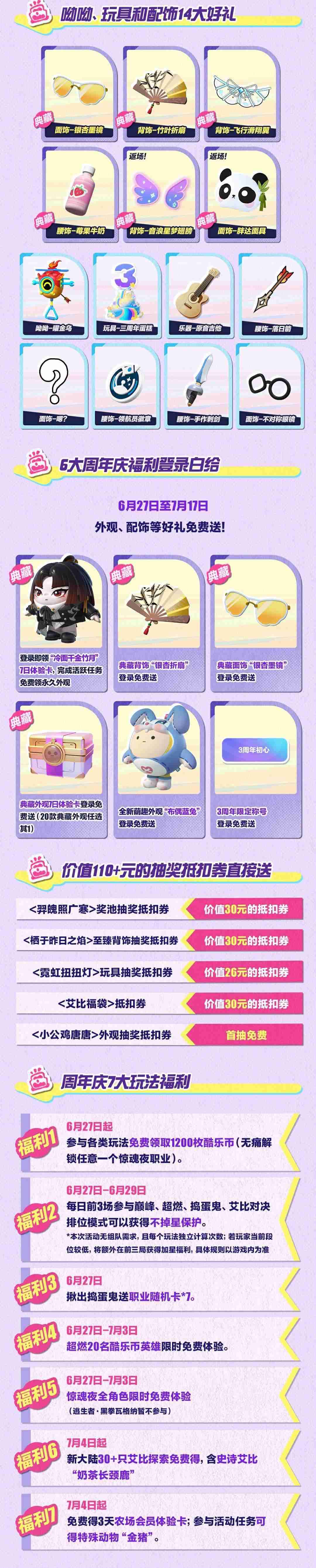 还有呦呦、玩具及配饰14大好礼,7大玩法福利和特惠抽奖抵扣券大派送!其中,6大周年庆福利登录即可免费得,动动手指直接全部拿下!