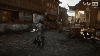 本次实机演示的场景带有浓厚的中国徽派古建筑风格:粉墙黛瓦、马头墙与天井;同时配合游戏运镜,在细节上,也可以观察到架设在白墙上的钢铁管道,肉眼可见的白色蒸汽以及远处隐约的浮空飞艇等等原属于西方工业化的产物。