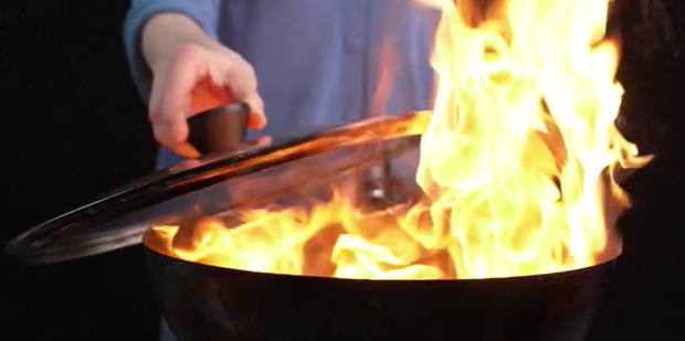 油锅起火千万不要慌,更不要用水泼! 油和水相遇会导致火焰瞬间爆开,非常危险。